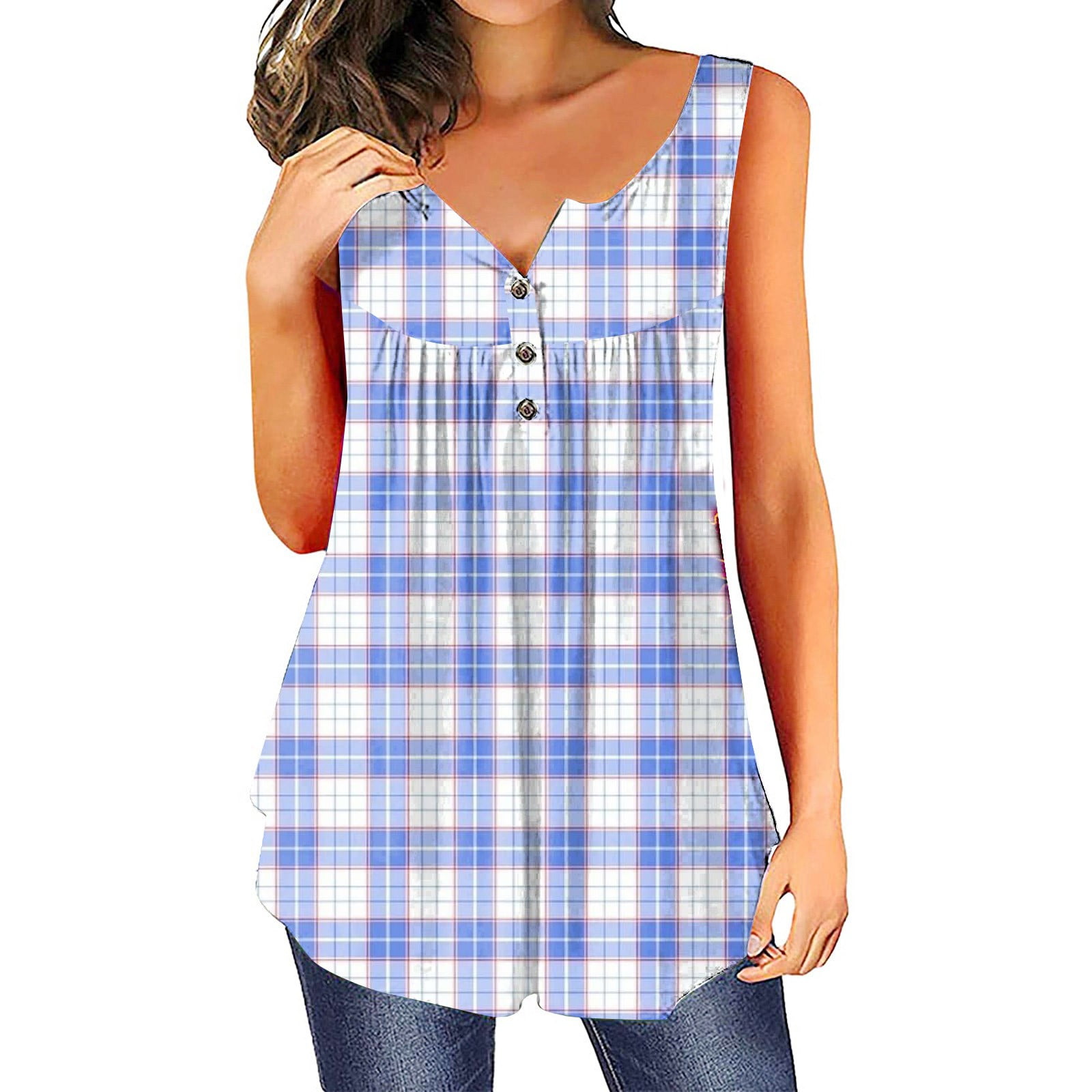 Biziza Tank Top For Women Plaid Henley Button Down Classic Fit Plus Size Sleeveless Tunic Top Blue L Walmart Com